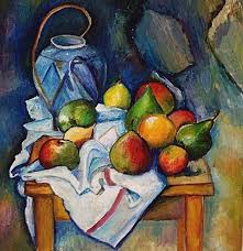 Bouilloire et fruits 1888 1890. Bouilloire et fruits is one of a type of still life compositions in which there is only one stabilizing vertical element the kettle around which the various groupings of 1 3 4 and 5 fruits are set within valleys of white drapery. These dispersed compositions are countered in his production by another type of still life in which the fruits are grouped in a circular bowl dish or basket around which a few dispersed elements are arranged so that they escape the order of the circle.
